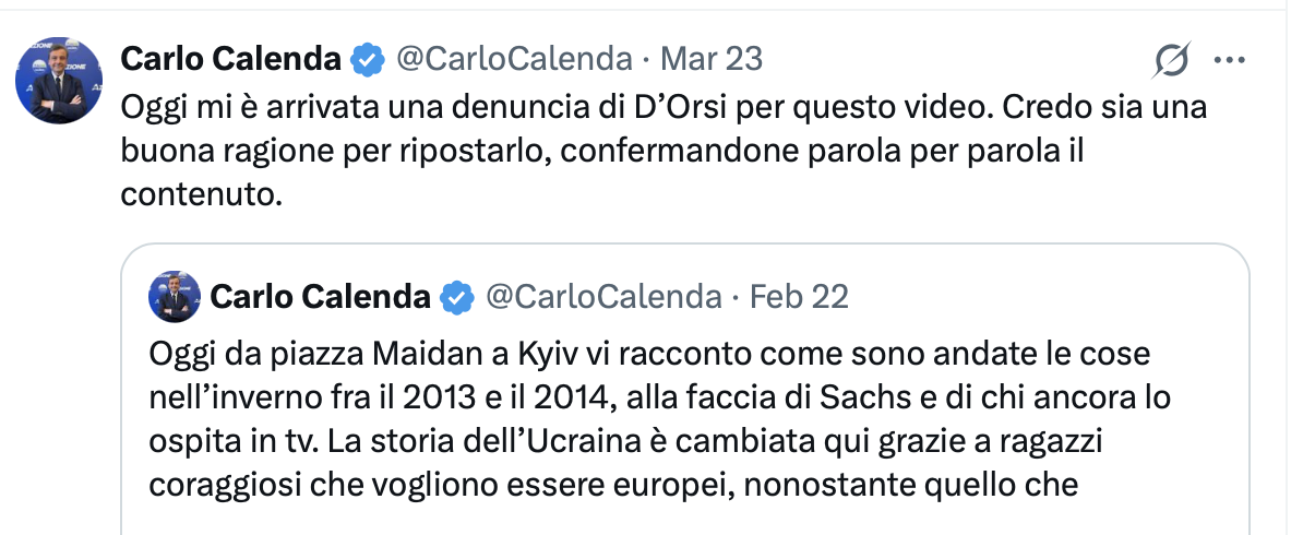 Tutto sembra cominciare con un video girato a Kiev, davanti a Maidan, il luogo che per alcuni incarna la libertà ucraina e per altri segna l’inizio di una lunga rimozione. Il leader di Azione Carlo Calenda lo rilancia il 23 marzo scorso su X e scrive di aver ricevuto una denuncia dal professor Angelo d’Orsi “per questo video”, dove attacca anche Jeffrey Sachs, l’economista statunitense e professore alla Columbia University, definendolo “quel cretino”.