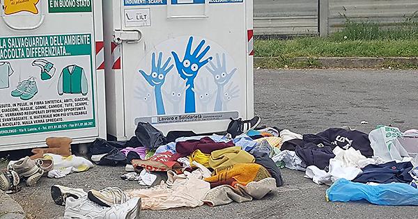 Ancora degrado in piazza Grande Torino. Nei giorni scorsi, ignoti hanno parzialmente svuotato il doppio contenitore per gli abiti e gli accessori da abbigliamento usati presenti nel piazzale dove al sabato viene allestito il mercato cittadino.