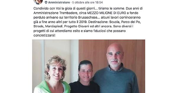 “Condivido con Voi la gioia di questi giorni... tiriamo le somme. Due anni di Amministrazione Trombadore, circa mezzo milione di euro a fondo perduto arrivano sul territorio Brusaschese... alcuni lavori cominceranno già a fine anno altri per tutto il 2019. Destinazione: Scuola, Parco del Po, Strade, Marciapiedi, Progetto Giovani ed altri ancora. Sono diversi i progetti di cui attendiamo esito e siamo fiduciosi che possano concretizzarsi!”.