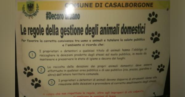 CASALBORGONE. Da qualche tempo a Casalborgone si può trovare affisso un cartello – da quel che sembra per iniziativa del Comune di Casalborgone, con tanto di stemma – che ricorda le regole per la “gestione degli animali domestici”, ma che di fatto si rivolge solo ai proprietari dei cani per ammonirli a comportarsi bene, rimuovendo opportunamente le “deiezioni” dal suolo pubblico.