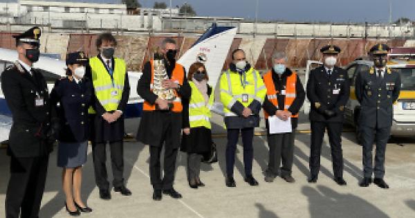 La statua è in viaggio tra gli scali italiani nell’ambito delle iniziative del Giubileo Lauretano per il centenario della proclamazione della Madonna di Loreto come patrona degli aviatori e dei viaggiatori.