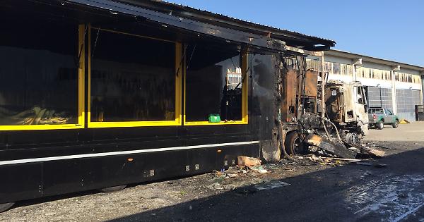 Nella notte un incendio ha distrutto il Tir Stralis e il rimorchio allestito per gli show-room nel piazzale della ditta B.F.E. Srl di frazione Betlemme