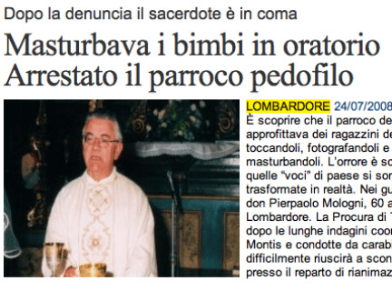 Don Pierpaolo Mologni, 60 anni all'epoca, parroco di Lombardore, avrebbe, secondo il racconto di Cronaca Qui, “masturbato bambini all’oratorio”.