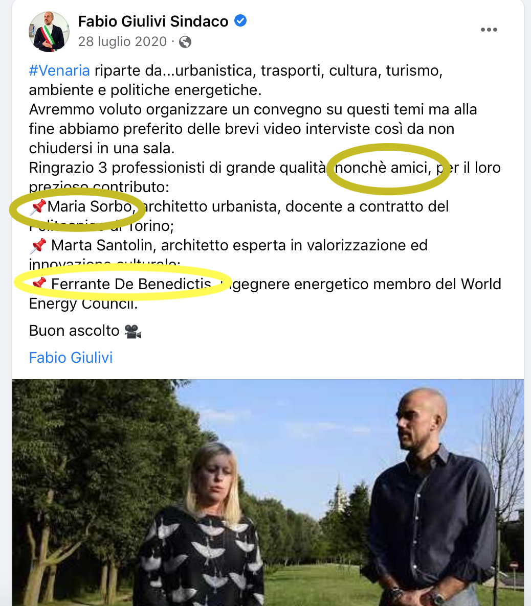 "Ringrazio - scrive sempre Giulivi - 3 professionisti di grande qualità, nonché amici, per il loro prezioso contributo: Maria Sorbo, architetto urbanista, docente a contratto del Politecnico di Torino; Marta Santolin (oggi assessore, ndr), architetto esperta in valorizzazione ed innovazione culturale; Ferrante De Benedictis, ingegnere energetico membro del World Energy Council. Buon ascolto".