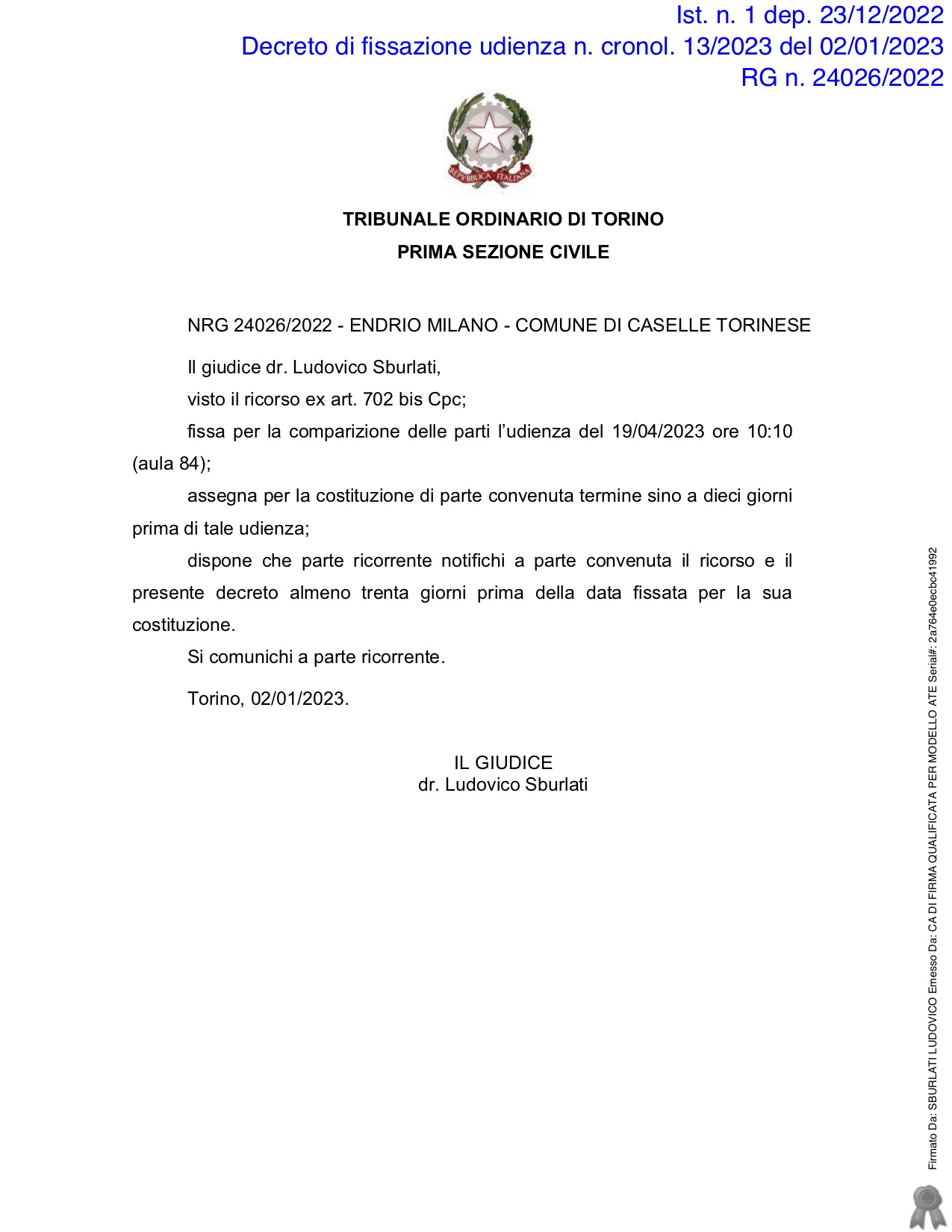 La palla passa al Tribunale Ordinario Civile di Torino e al giudice Ludovico Sburlati. Appuntamento fissato per il 19 aprile 2023, ore 10,10, aula 84.