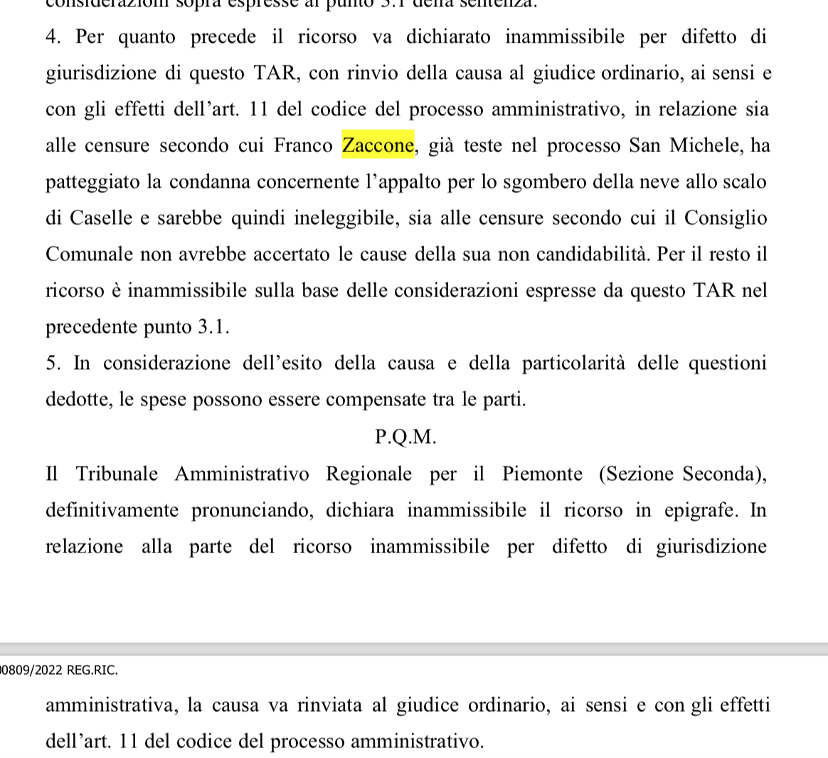 “Per quanto precede il ricorso - si legge nella sentenza - va dichiarato inammissibile per difetto di giurisdizione di questo TAR, con rinvio della causa al giudice ordinario, ai sensi e con gli effetti dell’art. 11 del codice del processo amministrativo, in relazione sia alle censure secondo cui Franco Zaccone, già teste nel processo San Michele, ha patteggiato la condanna concernente l’appalto per lo sgombero della neve allo scalo di Caselle e sarebbe quindi ineleggibile, sia alle censure secondo cui il Consiglio Comunale non avrebbe accertato le cause della sua non candidabilità”. Insomma, checché ne dica qualche consigliere di maggioranza improvvisato, il tema resta: la maggioranza ha candidato qualcuno che non era candidabile? Non si sa, non è chiaro, un’eventualità che non era stata chiarita neanche dalla memoria difensiva depositata dal Comune prima dell’udienza.