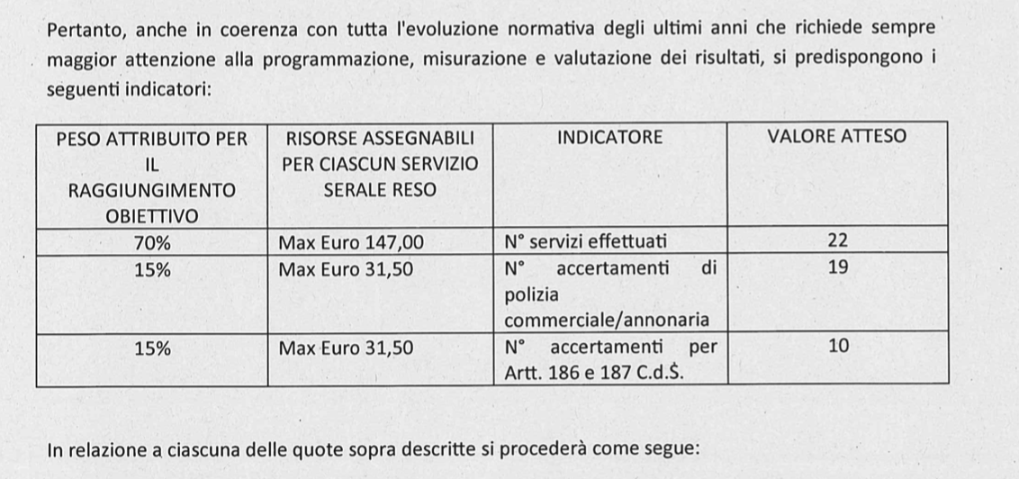 Ed eccoli gli indicatori (qui sopra in foto): l’amministrazione si attende 22 servizi effettuati nell’orario serale da ciascun agente che aderirà al progetto. Chi effettuerà questo numeri di servizi serali potrà contare su 147 euro in più per ciascun servizio serale reso.