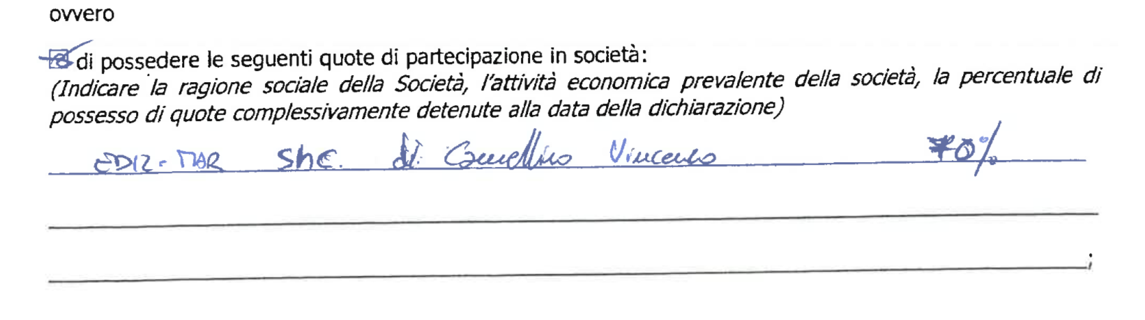 In un altro documento, poi, sempre Camellino, scrive (nel 2019) di possedere le seguenti quote di partecipazione: il 70% della Edil Mar Snc di Vincenzo Camellino.