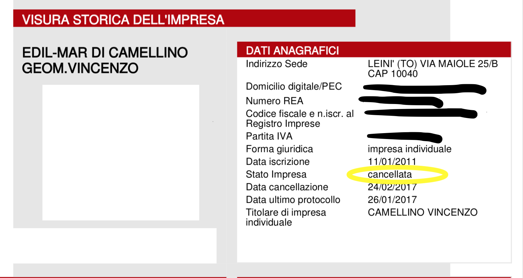 Arriviamo, però, alle contraddizioni. È tutto molto semplice: le dichiarazioni scritte da Camellino non hanno senso. Leggendo la visura camerale dell'azienda (di cui siamo in possesso) emerge chiaramente come la Edil Mar Snc abbia cessato la sua attività il 31/12/2016. La data di cancellazione, poi, risale al 24 febbraio 2017.