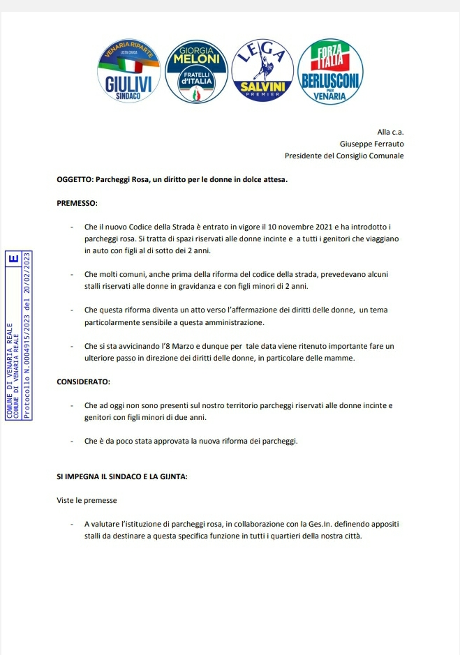 “Il nuovo Codice della Strada - scrive la maggioranza nella mozione - è entrato in vigore il 10 novembre 2021 e ha introdotto i parcheggi rosa. Si tratta di spazi riservati alle donne incinte e a tutti i genitori che viaggiano in auto con figli al di sotto dei 2 anni”.