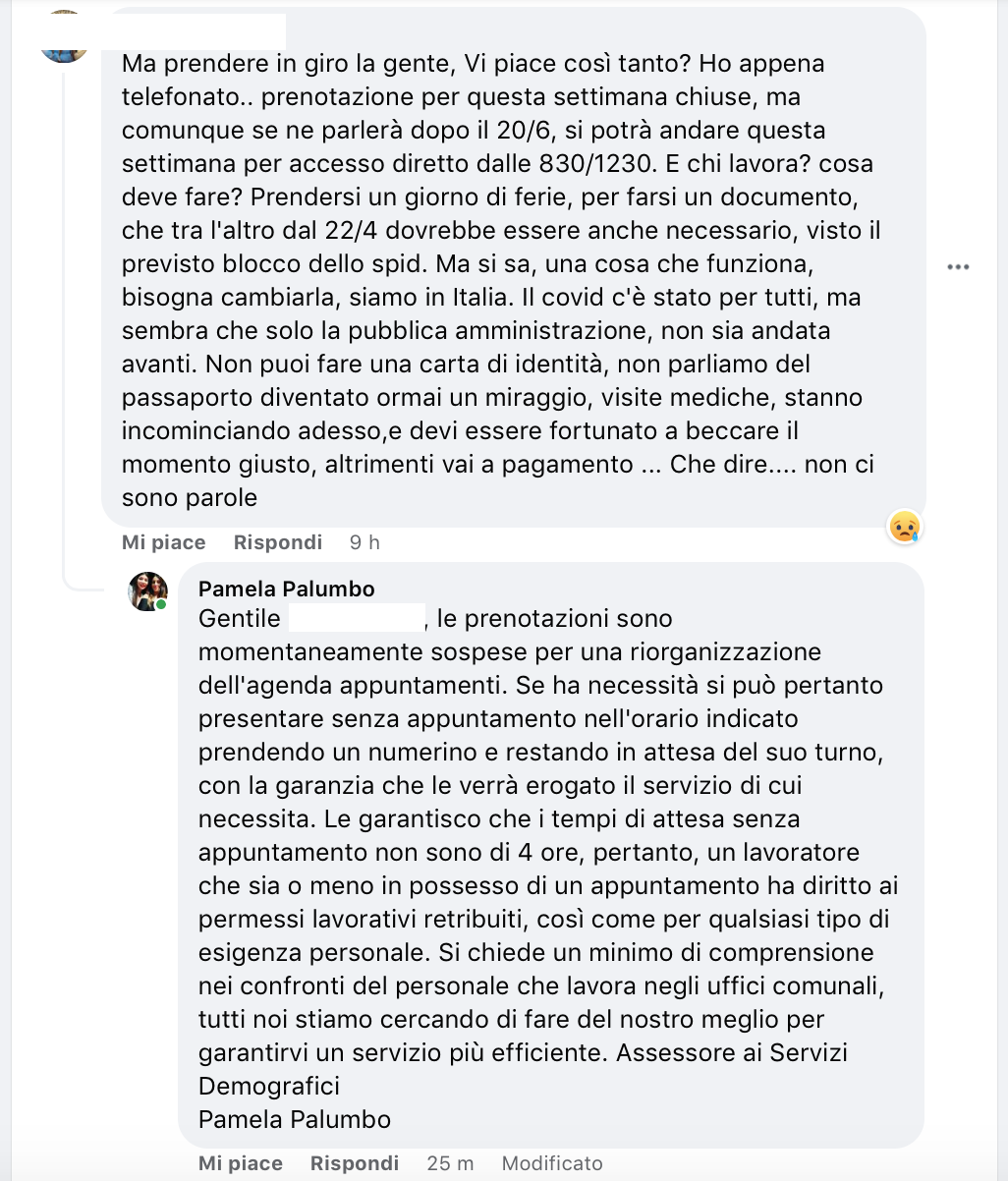 “Le prenotazioni - scrive - sono momentaneamente sospese per una riorganizzazione dell’agenda appuntamenti. Se ha necessità si può pertanto presentare senza appuntamento nell’orario indicato prendendo un numerino e restando in attesa del suo turno, con la garanzia che le verrà erogato il servizio di cui necessita. Le garantisco che i tempi di attesa senza appuntamento non sono di 4 ore, pertanto, un lavoratore che sia o meno in possesso di un appuntamento ha diritto ai permessi lavorativi retribuiti, così come per qualsiasi tipo di esigenza personale. Si chiede un minimo di comprensione nei confronti del personale che lavora negli uffici comunali, tutti noi stiamo cercando di fare del nostro meglio per garantirvi un servizio più efficiente”.
