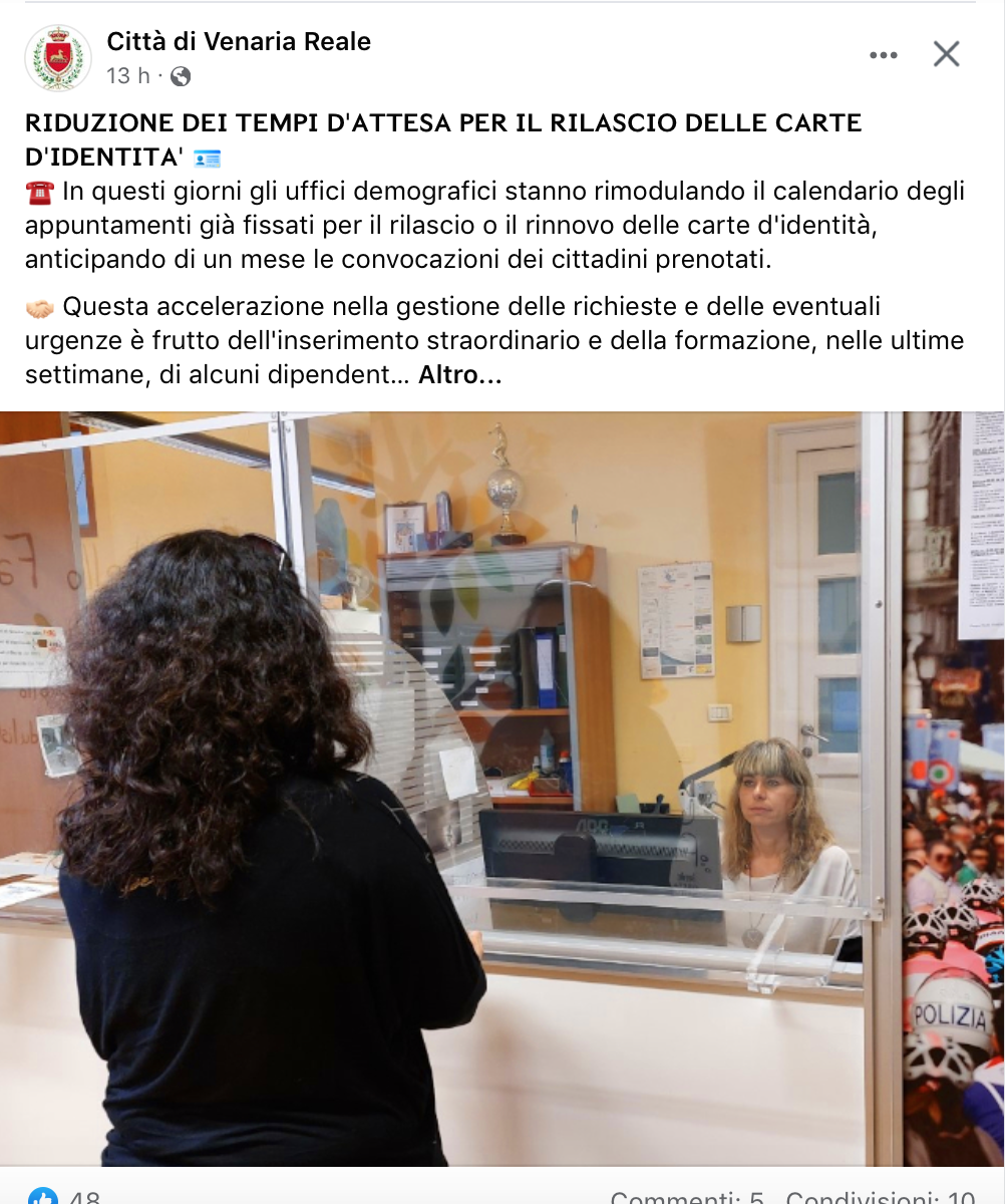 Ma partiamo dal post pubblicato sulla pagina social della Città di Venaria lunedì 13 marzo.