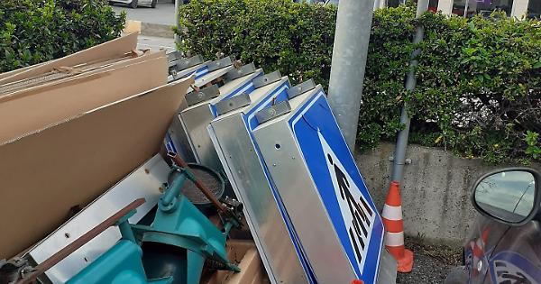 I segnali stradali accatastati nello spazio riservato alla salita e alla discesa dei veicoli
