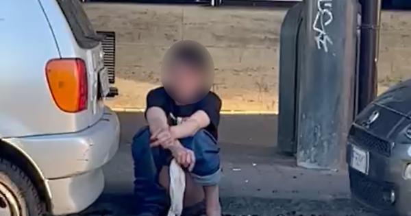 Poi, l’uomo scende dal marciapiede, si mette tra due auto in sosta e, mentre continuano a filmarlo, si abbassa i pantaloni e si mette a far la cacca davanti a tutti, mostrando le parti intime alla camera del cellulare.