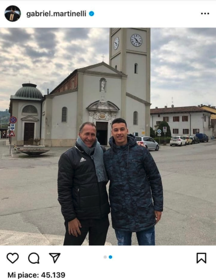 Gabriel Martinelli in piazza Risorgimento a Lauriano con il padre in una fotografia che lo stesso calciatore ha postato sui social