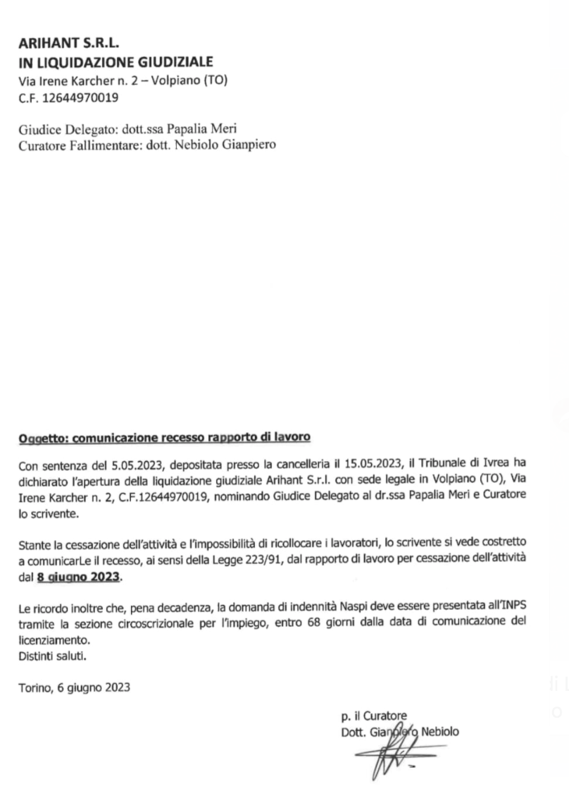 La comunicazione è arrivata martedì 6 giugno nelle mani dei dipendenti, un documento scritto e firmato dal curatore fallimentare: "Stante la cessazione dell'attività e l'impossibilità di ricollocare i lavoratori, lo scrivente si vede costretto a comunicarLe il recesso dal rapporto di lavoro per cessazione dell'attività dal 8 giugno 2023".