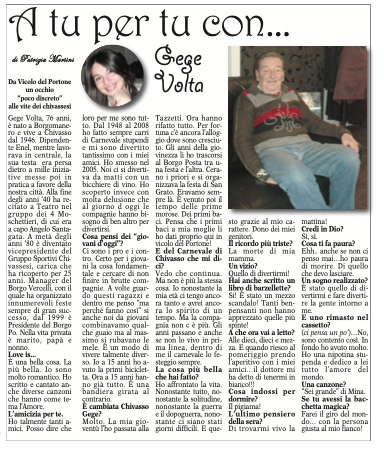 E’ impossibile non piangere, oggi, a leggere e rileggere l’intervista che il 25 gennaio 2010 il mitico Gege Volta rilasciò a Patrizia Martini, all’epoca collaboratrice del giornale La Voce con la rubrica “A tu per tu con…”.