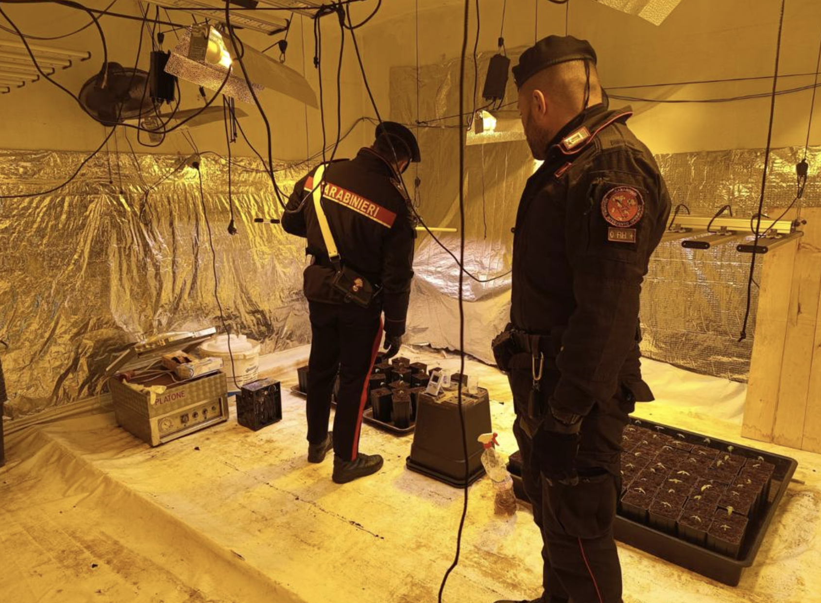 La proprietà del cascinale è al momento oggetto di accertamento. L'uomo è stato scoperto nell'atto di coltivare una piantagione di marijuana all'interno dei locali adibiti a serra. La struttura era dotata di un articolato sistema di illuminazione con apposite lampade, ventilazione avanzata e irrigazione tramite sistema idraulico.
