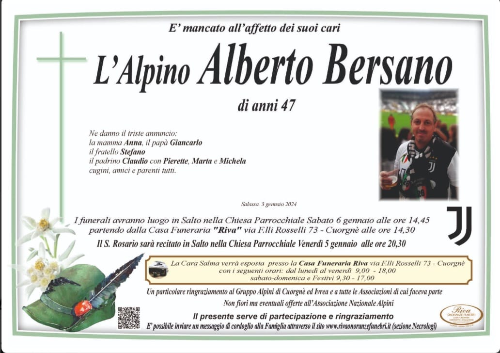 Alberto Bersano avrebbe compiuto 48 anni a febbraio. Viveva a Cuorgné in frazione Salto dove era nato. La sua vita si è improvvisamente spezzata durante una partita di calcio a 5 sui campi da gioco di Salassa. Una sgambata per smaltire i pranzi e le cene delle feste, come aveva scritto in quell'ultimo posto in cui si vedevano i suoi piedi sul tappeto di quell'erba da cui, solo tre ore dopo, non si sarebbe più alzato.