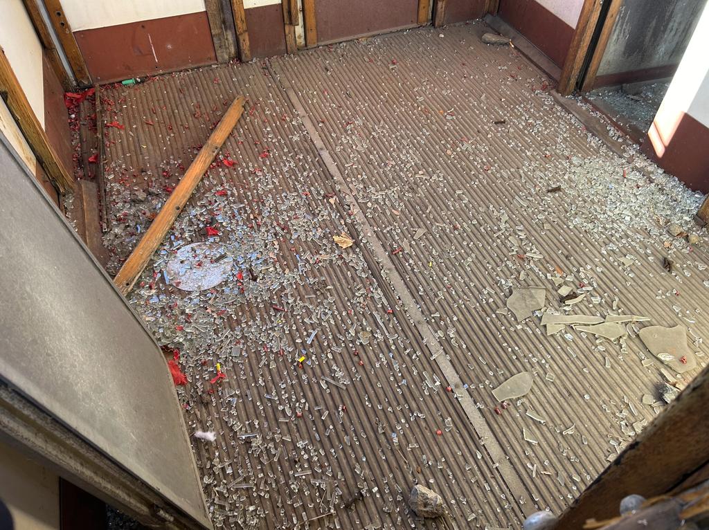 L'interno del vagone, con i vetri distrutti e i petardi a terra
