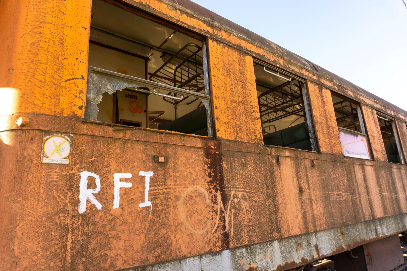 Il vagone, fermo al terzo binario (tronco) della stazione, è abbandonato in questa sorta di deposito e cielo aperto da moltissimo tempo, mezzo arrugginito, con i vetri rotti e sedili spostati e circondati da rifiuti. Il tutto, a letteralmente due passi dalle abitazioni che si affacciano sulla ferrovia da entrambi i lati. Avvicinandosi al sito, poi, si può notare come dalla cabina di accesso, qualcuno sia entrato all’interno e abbia fatto esplodere dei botti: i resti dei petardi e dei vetri saltati in aria sono lì, per terra.
