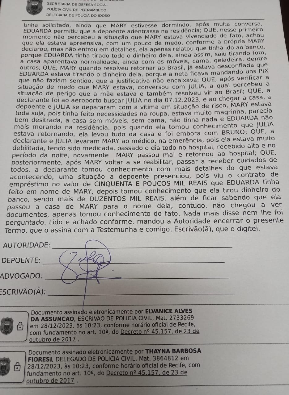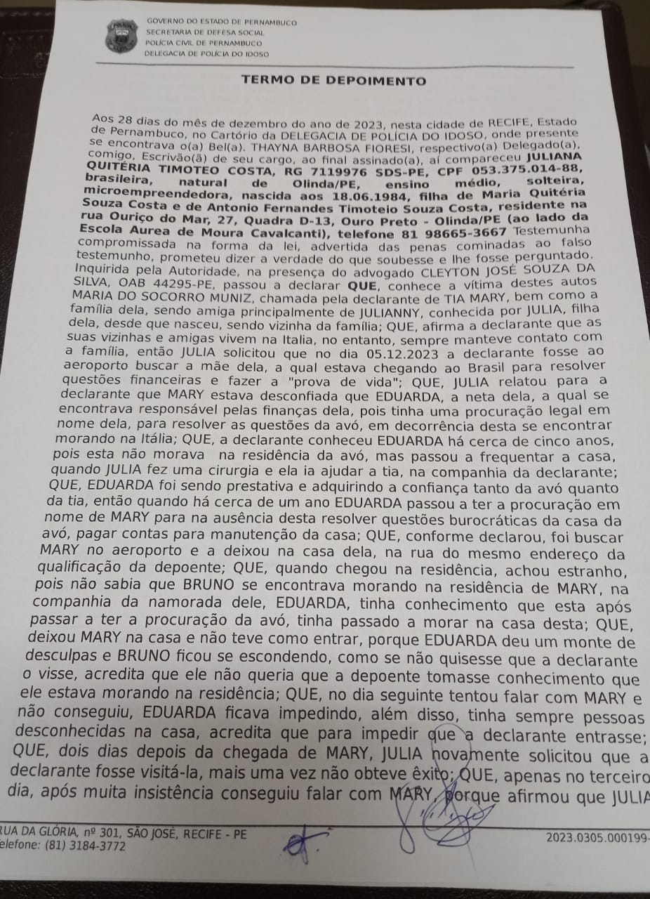 Il 26 dicembre scorso, la polizia ha iniziato gli interrogatori. Julianny e Marilù sono state le prime ad essere interrogate. Subito dopo è stata sentita la testimone chiave, la vicina Juliana Costa, la quale ha dichiarato, come riporta il verbale, che Eduarda non voleva farla entrare in casa perché asseriva che la nonna stava male e si era recata in Brasile oramai in fin di vita, per morire.