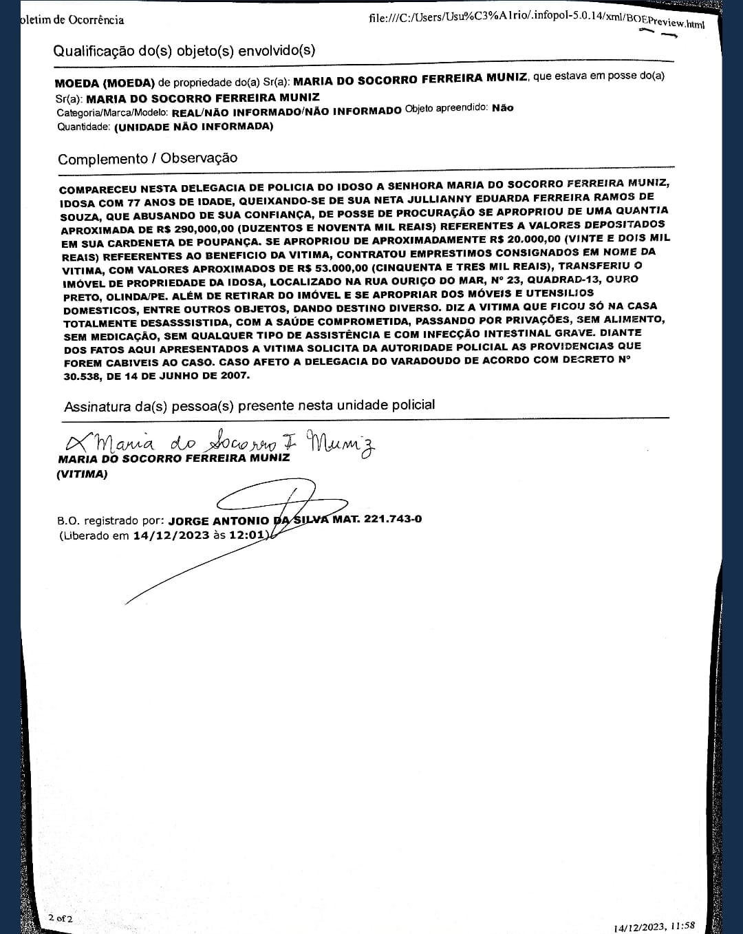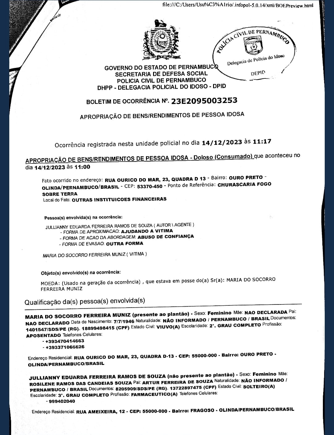 Copia della dichiarazione rilasciata il 14 dicembre scorso da Marilù e Julianny Muniz alla sezione "Delegacia de polìcia do idolo" della della 'Policia Civil', che si occupa dei casi inerenti gli anziani, la parte della popolazione maggiormente soggetta alle truffe.