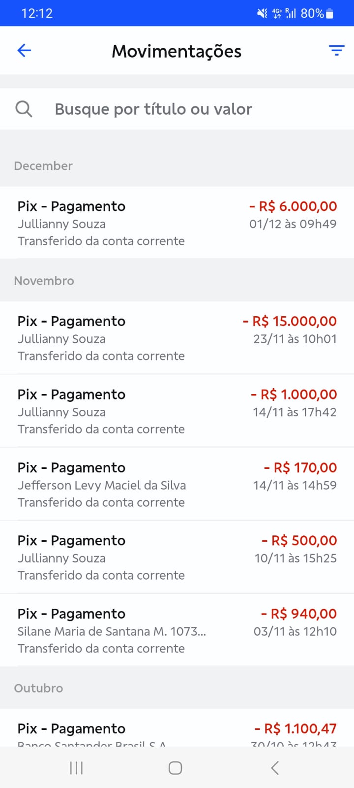 Una delle 21 pagine dell'estratto conto contenente le ingenti somme di denaro che venivano trasferite di continuo dal conto di Marilù sul conto della nipote “Julianny Souza” (Eduarda), per mano di quest'ultima.