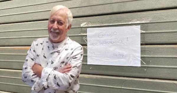 Pier Carlo Borca di fronte alla serranda abbassata del suo bar, dove campeggia la scritta "Chiuso per infortunio. Pier'54"