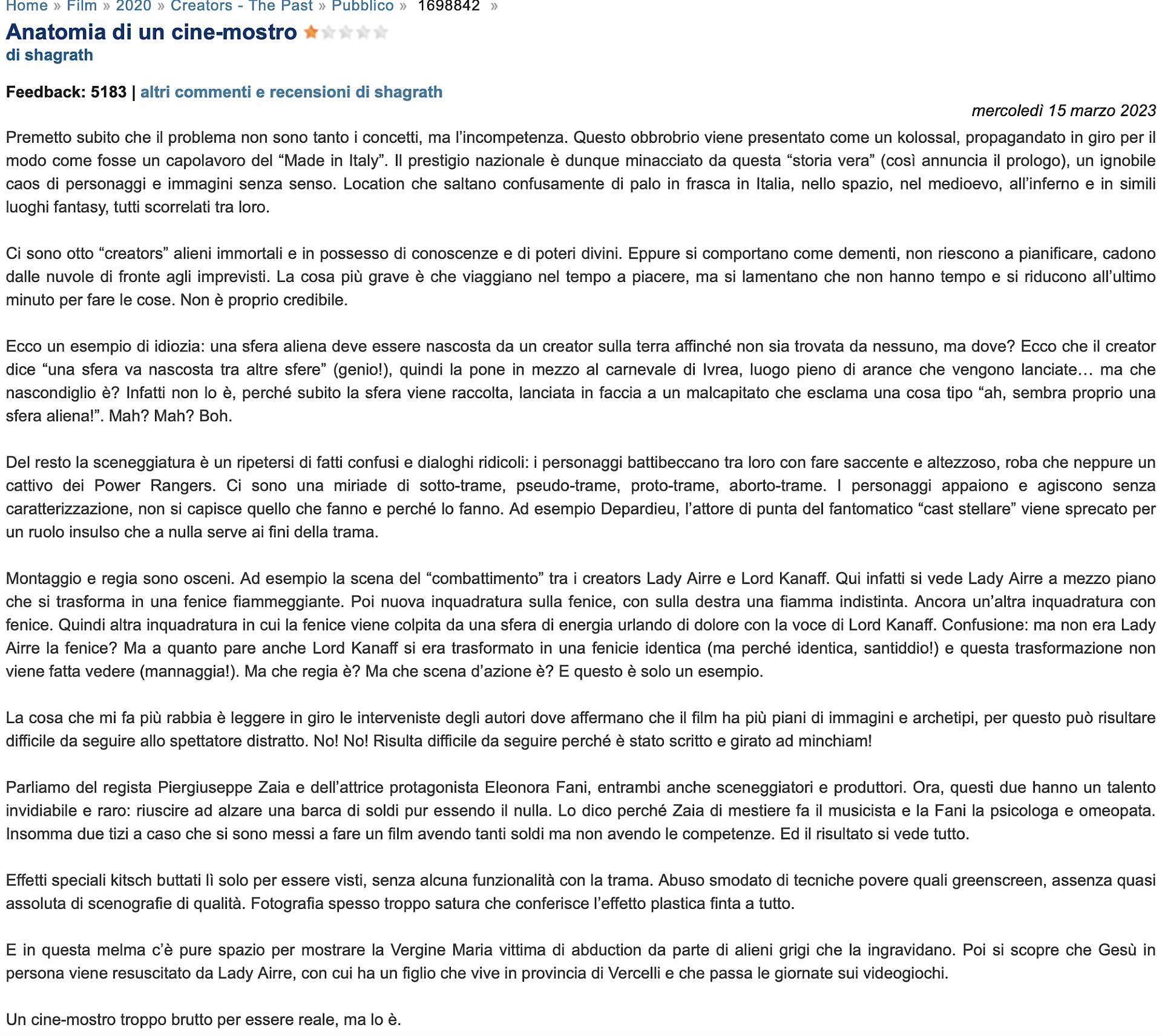 Ad alimentare ulteriormente le polemiche è la recensione di MyMovies, che descrive il film come “un cine-mostro troppo brutto per essere reale”. La critica pubblicata da un utente certificato stronca senza appello la pellicola, definendola un “caos di personaggi e immagini senza senso”, con una sceneggiatura piena di incongruenze e effetti speciali kitsch inseriti senza logica narrativa. “Gli alieni viaggiano nel tempo, ma si lamentano di non avere tempo”, scrive l’autore della recensione, che cita episodi assurdi come il nascondiglio della sfera aliena nel bel mezzo del Carnevale di Ivrea, ritenendolo un esempio della totale mancanza di coerenza del film. Il giudizio sulla regia è impietoso: scene d’azione confuse, montaggio caotico e un uso esagerato del green screen, con una fotografia troppo satura che dà un effetto di “plastica finta”.