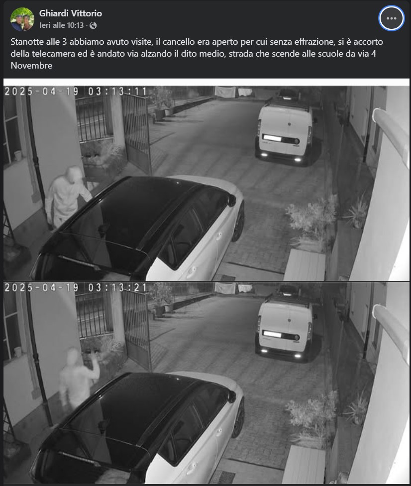 Le immagini, datate 19 aprile 2025 alle ore 03:13, sono nitide e hanno creato allarme tra i residenti. In molti chiedono maggiori controlli e tornano a sollevare il tema della sicurezza anche nei piccoli centri come Lessolo. Le forze dell’ordine sono state informate, ma al momento non risultano denunce formali: l’invito, diffuso anche attraverso i social, è a segnalare ogni movimento sospetto e fornire eventuali elementi utili per l’identificazione del soggetto.