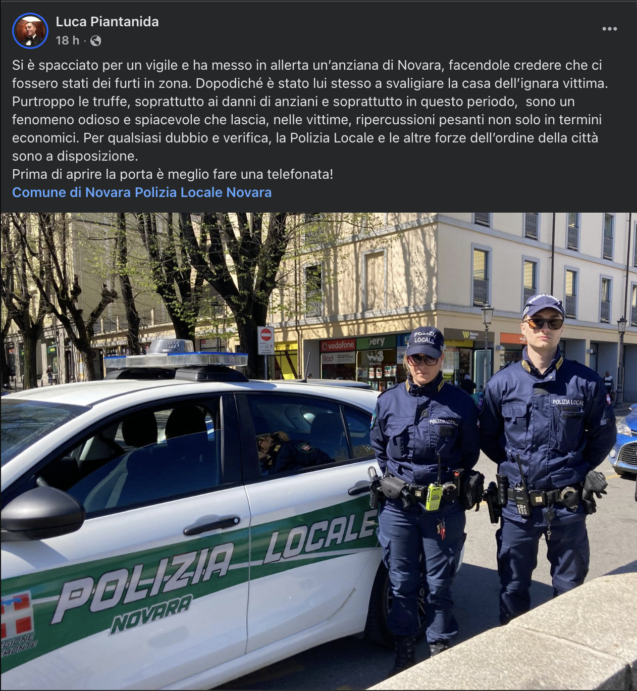 Il Comune di Novara, attraverso la Polizia Locale, ha diffuso un duro comunicato di condanna dell’accaduto. «Si è spacciato per un vigile e ha messo in allerta un’anziana di Novara, facendole credere che ci fossero stati dei furti in zona. Dopodiché è stato lui stesso a svaligiare la casa dell’ignara vittima. Purtroppo le truffe, soprattutto ai danni di anziani e soprattutto in questo periodo, sono un fenomeno odioso e spiacevole che lascia, nelle vittime, ripercussioni pesanti non solo in termini economici. Per qualsiasi dubbio e verifica, la Polizia Locale e le altre forze dell’ordine della città sono a disposizione. Prima di aprire la porta è meglio fare una telefonata!» si legge nella nota.