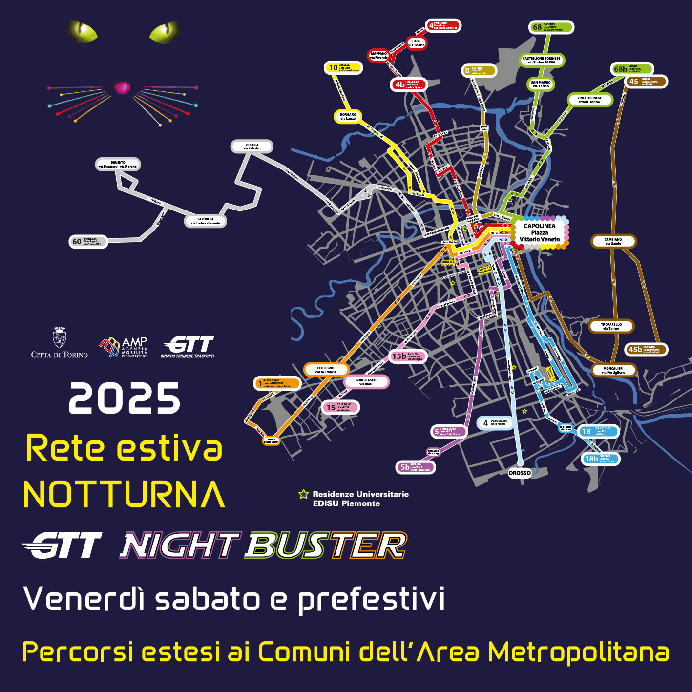 Attivo dalle 23 alle 5, il Night Buster copre l’intera estate con 17 linee dedicate che raggiungono 29 comuni dell’area metropolitana: da Rivoli a Settimo, da Caselle a Chieri, da Orbassano a Vinovo. Il nodo principale resta piazza Vittorio Veneto, hub centrale della movida torinese e punto di partenza e arrivo per tutte le corse.