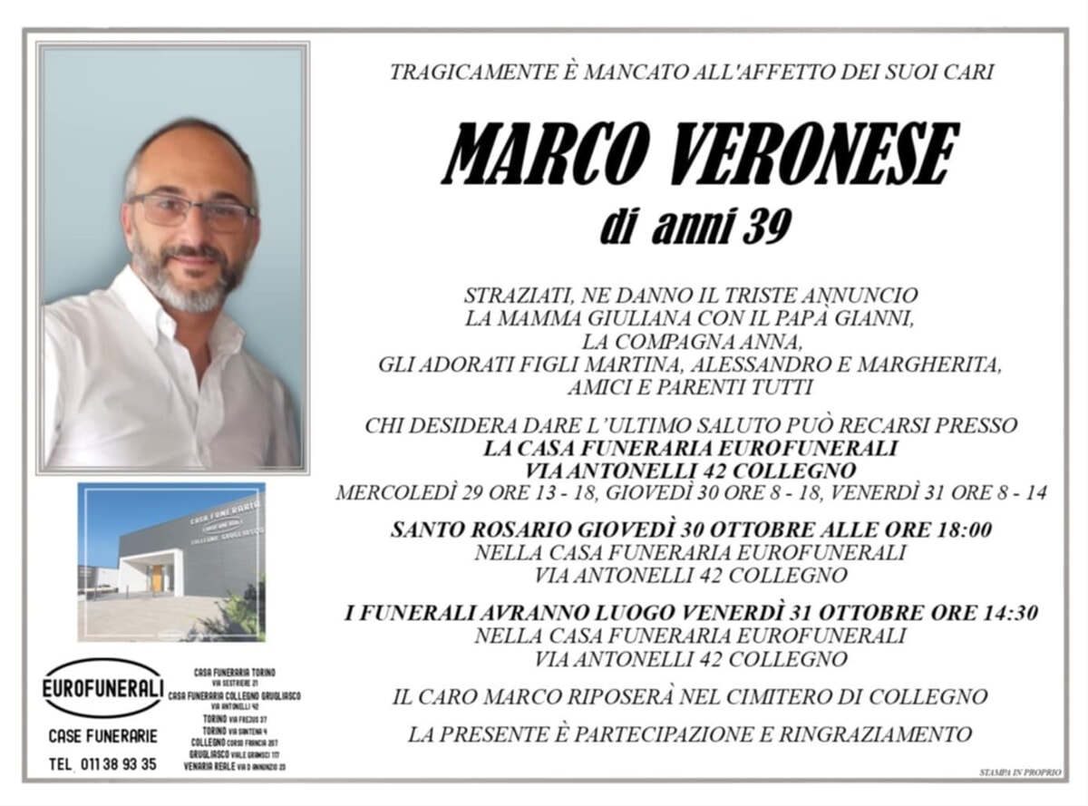Saranno celebrati venerdì 31 ottobre alle 14.30 i funerali di Marco Veronese, il 39enne ucciso a coltellate a Collegno. Il rito funebre si terrà nella casa funeraria Eurofunerali di via Antonelli 42, la stessa dove giovedì 30 alle 18 verrà recitato il Rosario. Veronese lascia tre figli, era separato e da tempo era tornato a vivere nella cittadina alle porte di Torino insieme ai genitori. L’uomo lavorava come installatore di impianti di videosorveglianza.