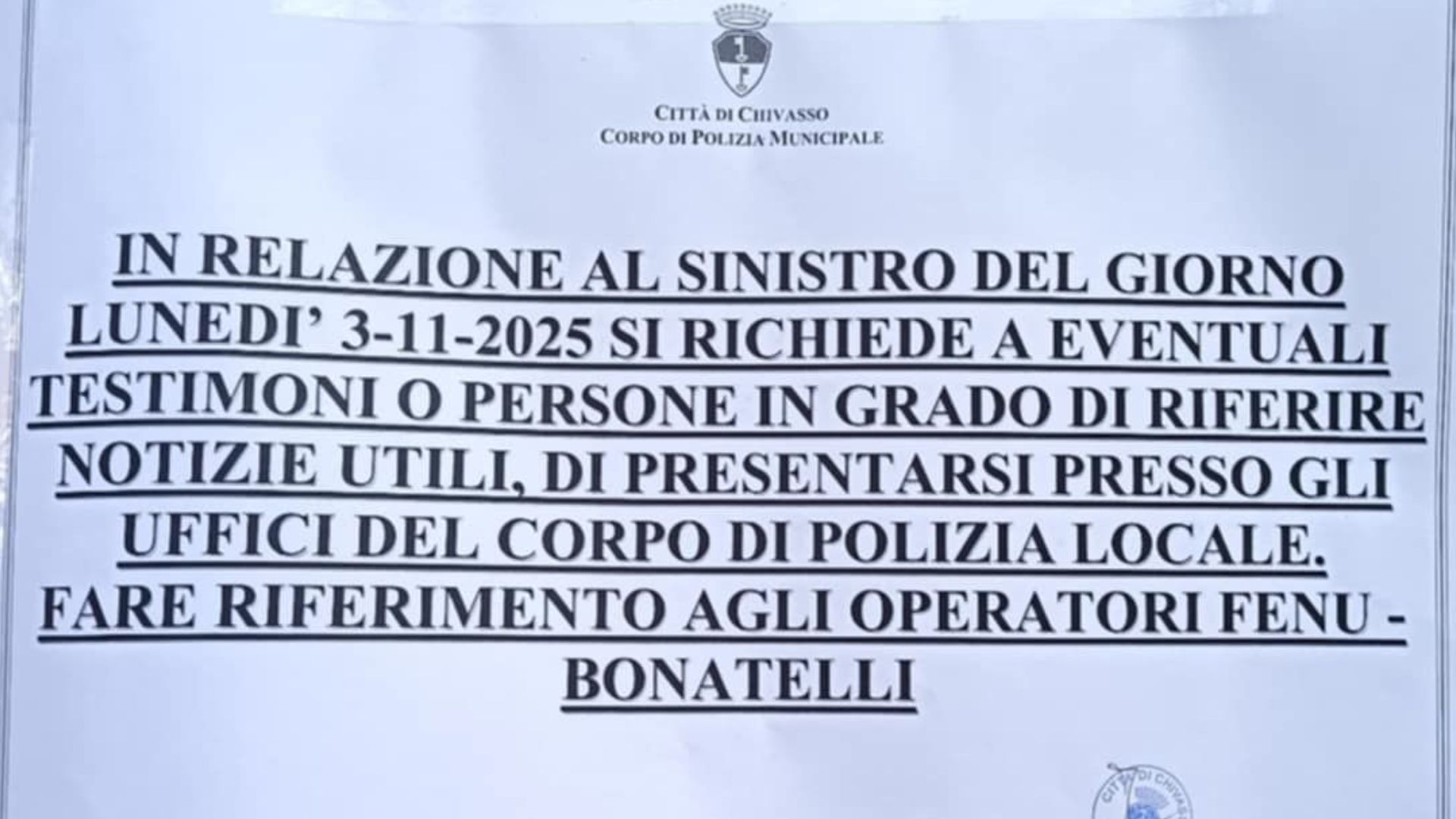 “Chiunque avesse informazioni o abbia assistito all’incidente avvenuto il 3 novembre 2025 in via Tellini è invitato a contattare gli Uffici di Polizia Municipale di Chivasso e chiedere degli operatori Fenu e Bonatelli.”