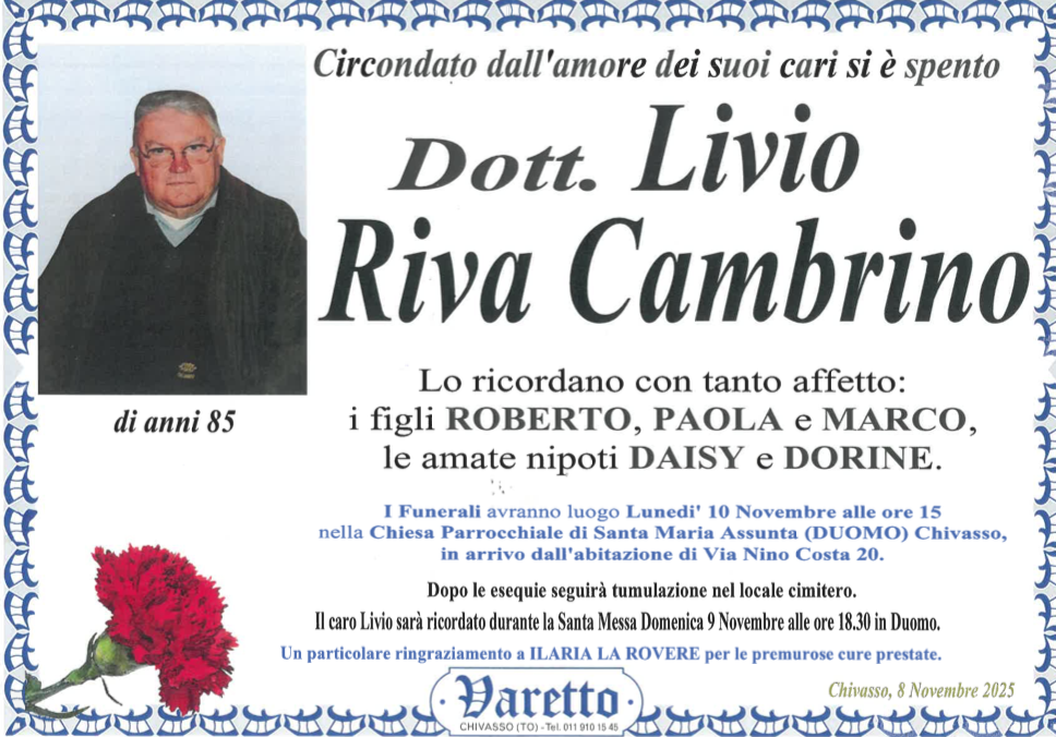 Si è spento a 85 anni, circondato dall’affetto dei suoi cari, Livio Riva Cambrino, figura storica della politica chivassese e protagonista di una stagione amministrativa che seppe coniugare impegno civile e passione socialista. A darne l’annuncio i figli Roberto, Paola e Marco, con le nipoti Daisy e Dorine. I funerali si terranno lunedì 10 novembre alle 15 nella Chiesa Parrocchiale di Santa Maria Assunta (Duomo) di Chivasso, con tumulazione nel cimitero locale.
