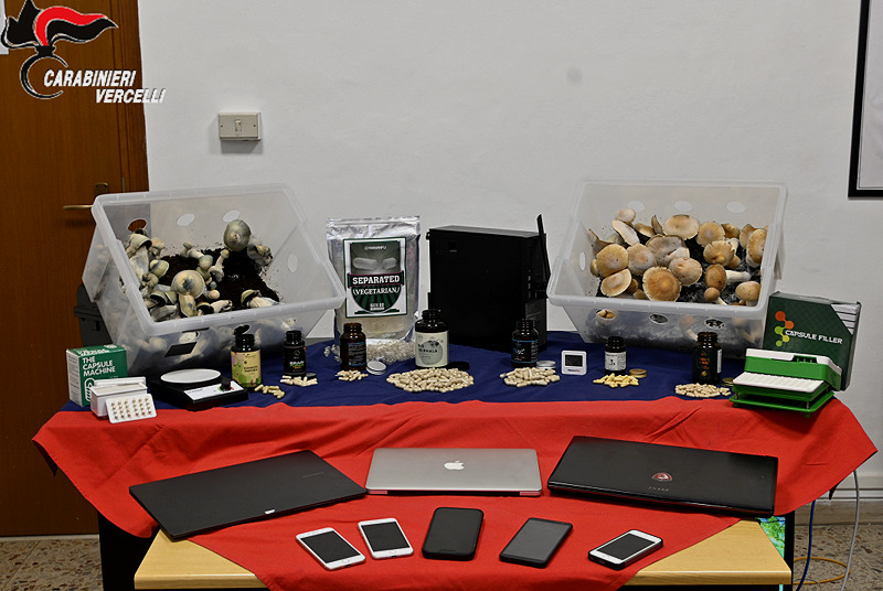 Parallelamente, i militari hanno eseguito perquisizioni all’interno del luogo degli incontri e nell’abitazione romana utilizzata dall’arrestato. È qui che è emerso il dato più sorprendente: un vero laboratorio clandestino, completo di funghi allucinogeni, compresse già confezionate e attrezzature per coltivazione, essiccazione e lavorazione. Un sequestro definito “assolutamente raro” nel panorama nazionale e mai registrato prima in provincia.