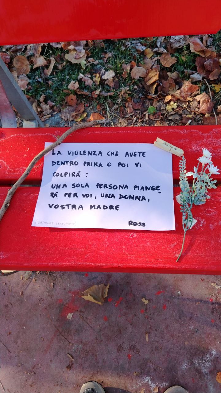 Sulla panchina distrutta è comparsa anche una scritta di risposta, firmata “Ross”: “La violenza che avete dentro prima o poi vi colpirà: una sola persona piangerà per voi, una donna, vostra madre”. Parole dure, che restituiscono la tensione del momento ma che, a loro volta, non si ispirano a toni concilianti. È un paradosso che interroga: quando il simbolo del rifiuto della violenza viene colpito, la rabbia rischia di sostituirsi al dialogo e di alimentare nuove fratture. Eppure proprio qui si misura la maturità di una comunità: nella capacità di reagire con fermezza, senza scivolare nella spirale che si intende combattere.