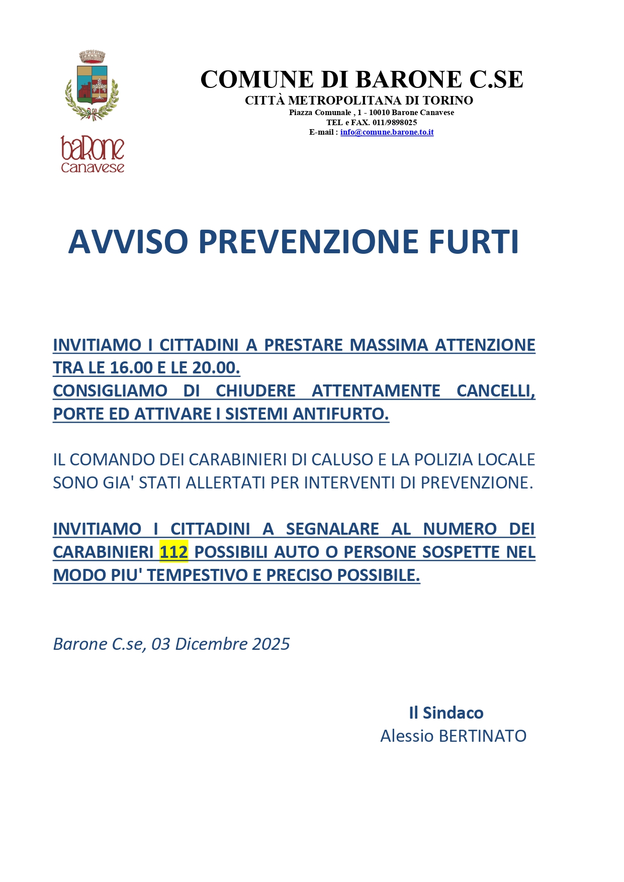 In un periodo che dovrebbe parlare soltanto di luci, presepi e abitudini familiari, Barone Canavese si ritrova a fare i conti con un clima diverso, segnato da nuove segnalazioni di furti, tentativi di truffa e raggiri ai danni dei residenti. L’amministrazione comunale, consapevole dell’inquietudine crescente, ha deciso di intervenire con un richiamo diretto alla popolazione. Un messaggio semplice, quasi asciutto, in perfetto stile pragmatico: vigilare, collaborare, segnalare.