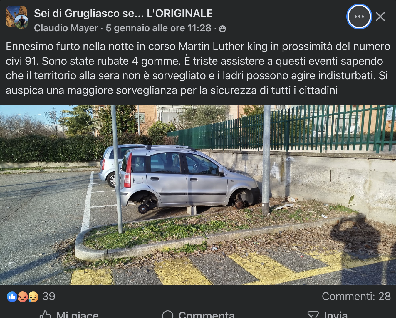 Un altro furto nella notte a Grugliasco, un episodio che si aggiunge a una lunga scia di segnalazioni e che torna a sollevare il tema della sicurezza nelle ore serali. È accaduto tra il 5 e il 6 gennaio in corso Martin Luther King, nei pressi del civico 91, dove ignoti hanno smontato e portato via quattro pneumatici da un’auto parcheggiata lungo la strada.