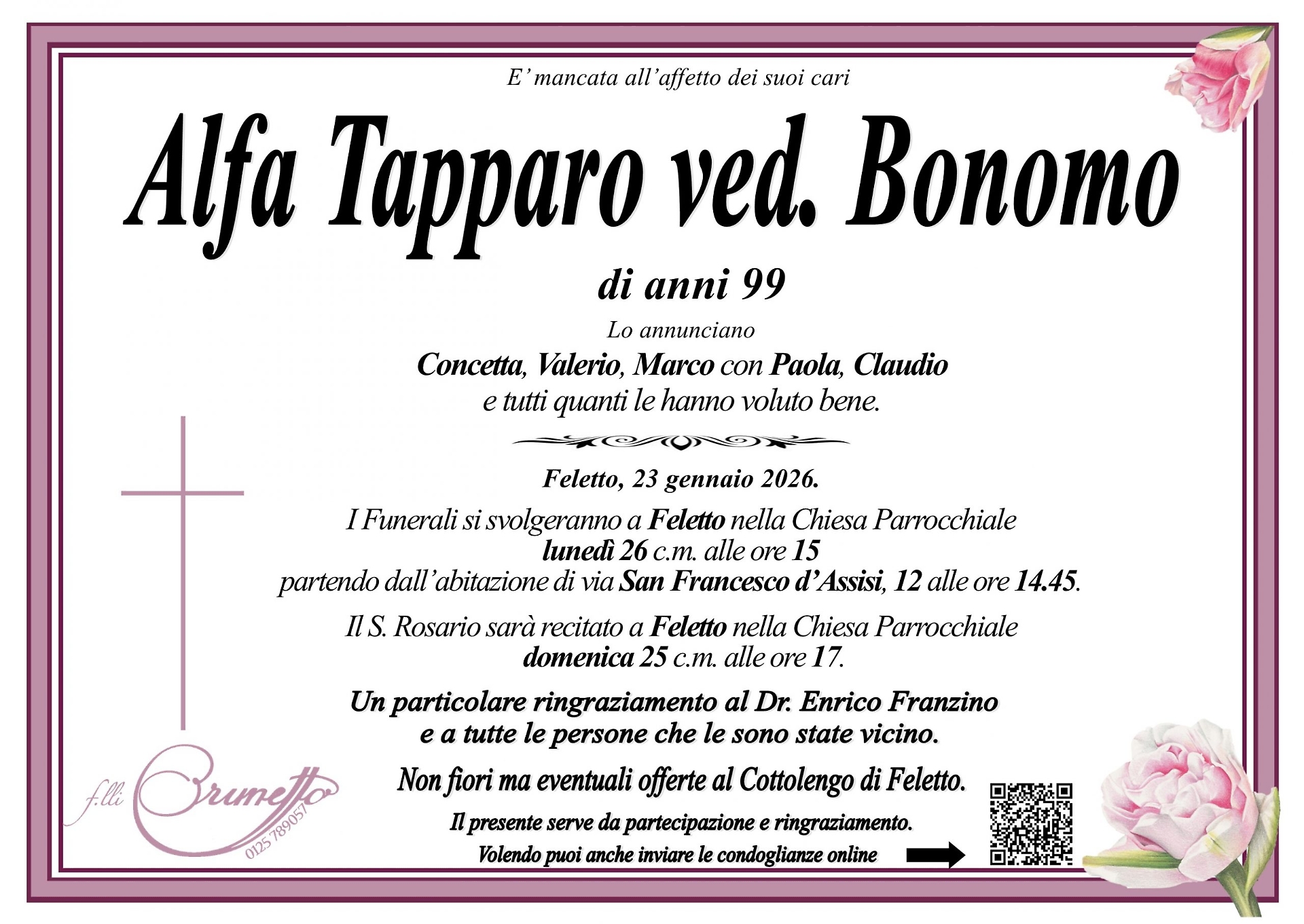 Pur essendo nata altrove, Alfa Tapparo ha vissuto gran parte della sua vita a Feletto, accogliendo e rispettando persone provenienti da contesti diversi, diventando un simbolo discreto di integrazione e convivenza. La sua scomparsa chiude un capitolo importante della memoria collettiva felettese, lasciando il ricordo di una donna che ha attraversato il Novecento senza mai smettere di partecipare alla vita della sua comunità.