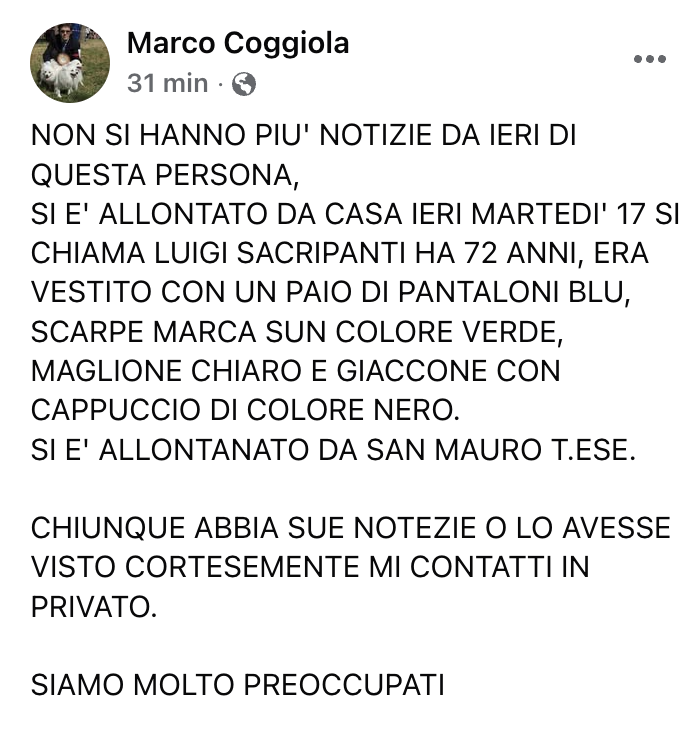 A 72 anni si allontana da casa e sparisce nel nulla: allarme a San Mauro Torinese