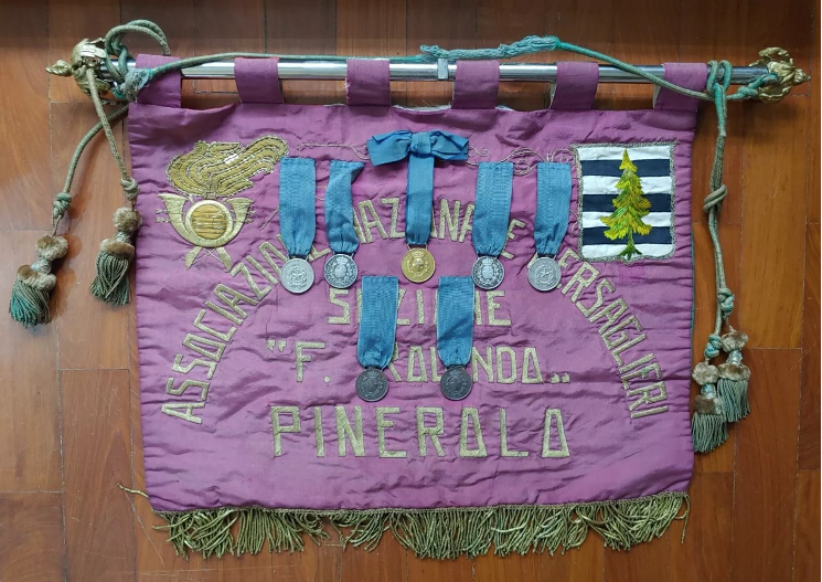 Il labaro è impreziosito dalle riproduzioni di sette medaglie — una d’oro, quattro d’argento e due di bronzo — attribuite ai Bersaglieri del territorio pinerolese distintisi durante il primo conflitto mondiale. Sul retro campeggia il tricolore italiano, elemento che rafforza il valore commemorativo e simbolico del manufatto.