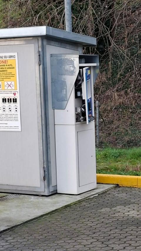 Si sono dirette verso la colonnina del pagamento automatico, quella dove si inseriscono monete, gettoni o carte per attivare il lavaggio. La parte frontale è stata completamente divelta, la scocca metallica piegata verso l’esterno, segno evidente dell’uso di uno strumento da scasso. Cablaggi e circuiti interni sono rimasti esposti. Dal contenitore sarebbero stati sottratti circa 100 euro.