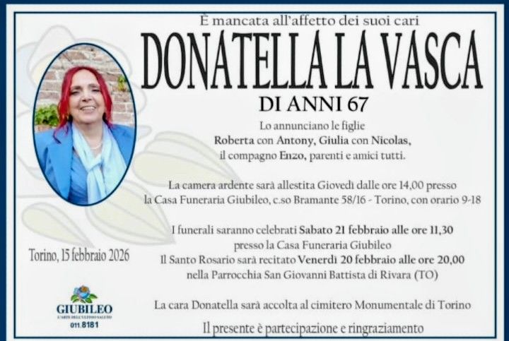 I funerali verranno celebrati sabato 21 febbraio alle 11.30 presso la Casa Funeraria Giubileo di Torino. La camera ardente sarà allestita da oggi, giovedì 19 febbraio 2026, dalle 14, nella stessa struttura di corso Bramante 58/16, con orario 9-18.