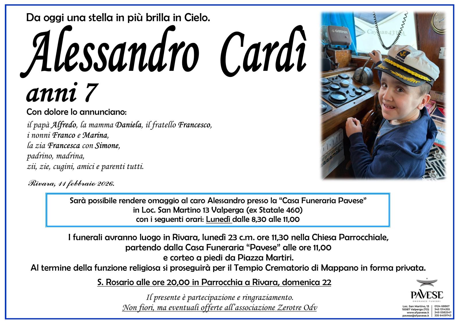 Una stella in più nel cielo, dice il necrologio. Ma a Rivara il cielo, da quella notte tra l’11 e il 12 febbraio, sembra più buio che mai. Alessandro Cardi, per tutti semplicemente Ale, aveva sette anni. È morto nel sonno, a pochi giorni da un intervento chirurgico eseguito all’ospedale Regina Margherita di Torino. Una fine improvvisa, che ha lasciato sgomenta un’intera comunità.