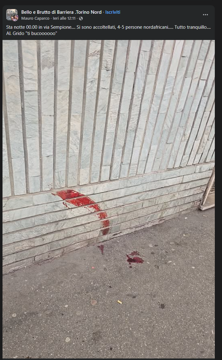 Nel frattempo, la vicenda ha trovato spazio anche sui social. In un post pubblicato nel gruppo Facebook “Bello e Brutto di Barriera. Torino Nord”, un utente ha scritto: «Sta notte 00.00 in via Sempione... Si sono accoltellati, 4-5 persone nordafricani.... Tutto tranquillo.... Al Grido “ti bucoooooo”».