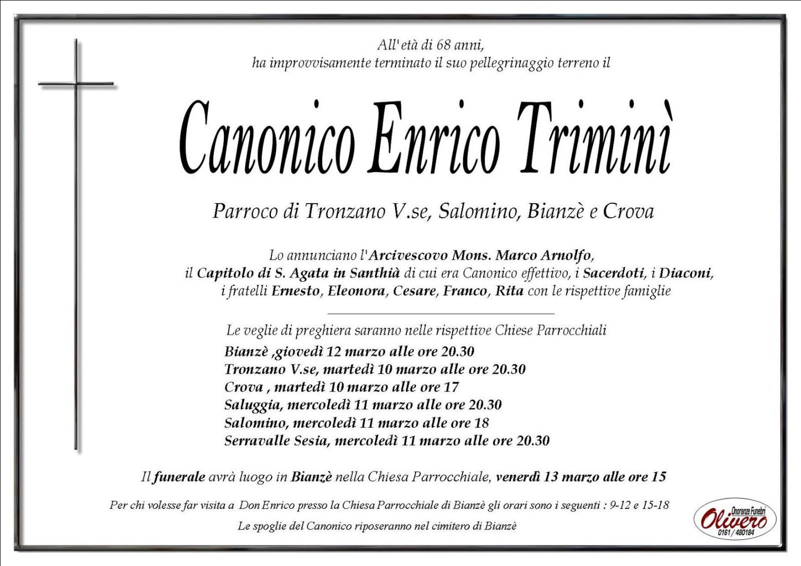 La sua scomparsa è stata annunciata ufficialmente dall’Arcivescovo di Vercelli, monsignor Marco Arnolfo, insieme al Capitolo di Sant’Agata in Santhià, di cui don Enrico era canonico effettivo, ai sacerdoti e ai diaconi della diocesi, oltre ai familiari: i fratelli Ernesto, Eleonora, Cesare, Franco e Rita, con le rispettive famiglie.