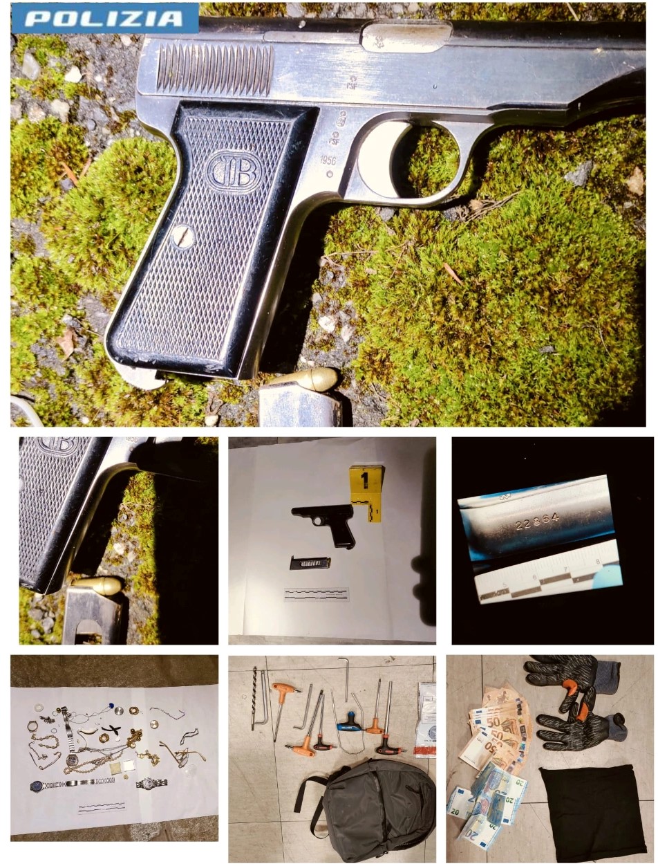 Durante la fuga, lungo il vialetto percorso dai malviventi, gli agenti hanno rinvenuto materiale di particolare gravità: una pistola risultata rubata in un precedente furto in abitazione, con un colpo già inserito nel caricatore, e una busta contenente numerosi oggetti preziosi, tra cui anelli, bracciali, collane e orologi.