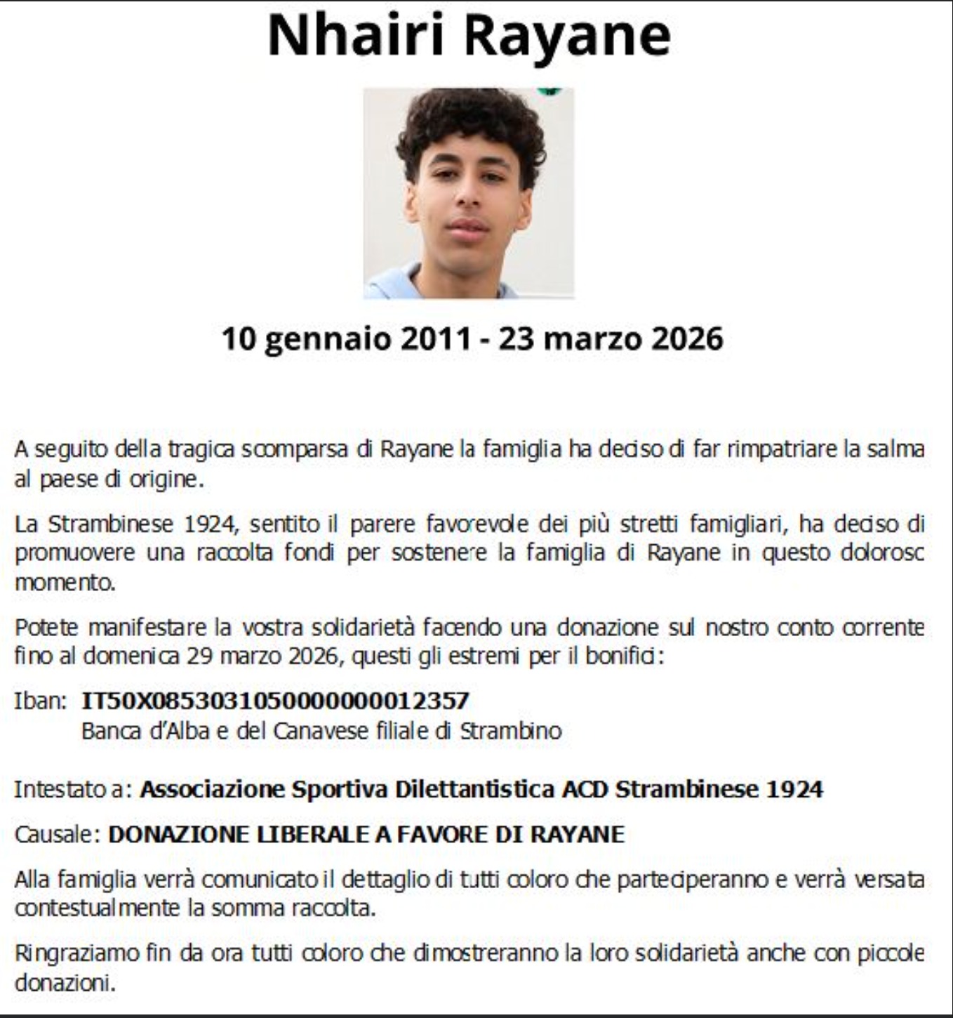 A farsi promotrice dell’iniziativa è stata la Strambinese 1924, che con il consenso dei familiari più stretti ha lanciato una raccolta fondi per sostenere la famiglia in questo momento drammatico. L’invito è chiaro: contribuire, anche con piccole somme, entro domenica 29 marzo 2026, attraverso un bonifico intestato all’Associazione Sportiva Dilettantistica ACD Strambinese 1924, con causale “Donazione liberale a favore di Rayane”.